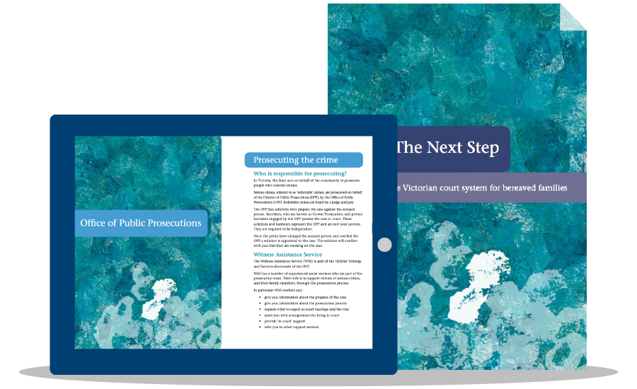 Taking The Next Step: A guide to the Victorian court system for bereaved families is a booklet produced by the Office of Public Prosecutions specifically for people who have lost loved ones to violent crime. It provides a step-by-step guide to the investigation and court process. It also provides contact details for relevant support and criminal justice agencies and explains how and where to access additional information and support.